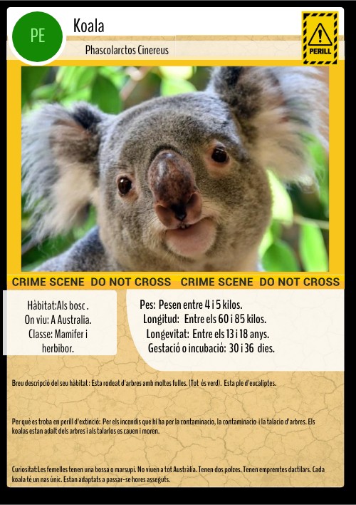 Breu descripció del seu hàbitat : Esta rodeat d'arbres amb moltes fulles. (Tot és verd). Esta ple d'eucaliptes. Per què es troba en perill d'extinció: Per els incendis que hi ha per la contaminacio, la contaminacio i la talacio d'arbres. Els koalas estan adalt dels arbres i als talarlos es cauen i moren. Curiositat:Les femelles tenen una bossa o marsupi. No viuen a tot Austràlia. Tenen dos polzes. Tenen empremtes dactilars. Cada koala té un nas únic. Estan adaptats a passar-se hores asseguts.