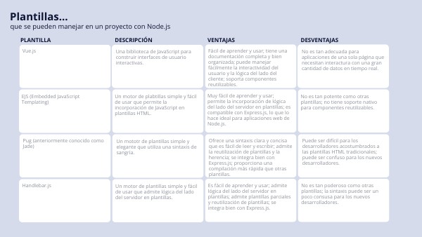 Es fácil de aprender y usar; admite lógica del lado del servidor en plantillas; admite plantillas parciales y reutilización de plantillas; se integra bien con Express.js.