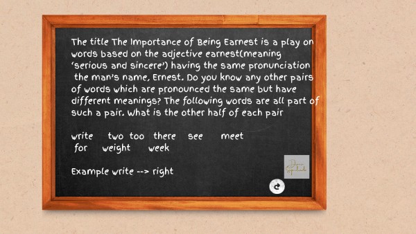 The title The Importance of Being Earnest is a play on words based on the adjective earnest(meaning ‘serious and sincere’) having the same pronunciation the man’s name, Ernest. Do you know any other pairs of words which are pronounced the same but have different meanings? The following words are all part of such a pair. What is the other half of each pair write two too there see meet for weight week Example write --> right