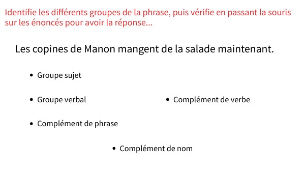 Identifie les différents groupes de la phrase, puis vérifie en passant la souris sur les énoncés pour avoir la réponse...