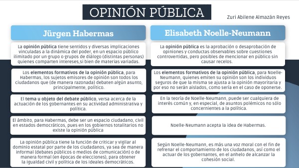 La opinión pública tiene sentidos y diversas implicaciones vinculadas a la dinámica del poder, en un espacio público ilimitado por un grupo o grupos de diálogo (distintas personas) quienes comparten intereses,si bien de materias variadas.