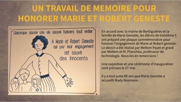 En accord avec la mairie de Berbiguières et la famille de Marie Geneste, les élèves de troisième C ont préparé une plaque commémorative pour honorer l'engagement de Marie et Robert geneste. Le dessin a été réalisé par Meltem Payet et gravé par Meltem et M. Planchou, professeur de technologie. Nous les en remercions ! Une expostion et une cérémonie d'inauguration sont prévues le 27 mai. Il y a tout juste 80 ans que Marie Geneste a accueilli Mady Kosmann.