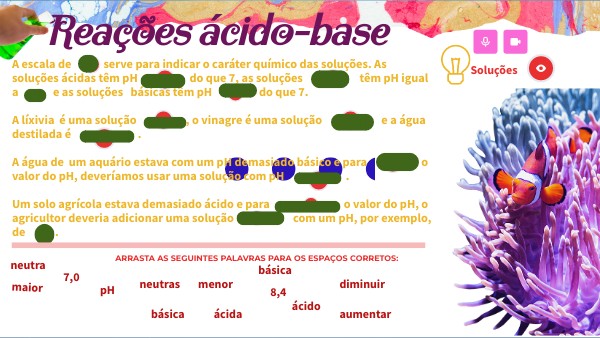 A escala de serve para indicar o caráter químico das soluções. As soluções ácidas têm pH do que 7, as soluções têm pH igual a e as soluções básicas têm pH do que 7. A líxivia é uma solução , o vinagre é uma solução e a água destilada é . A água de um aquário estava com um pH demasiado básico e para o valor do pH, deveríamos usar uma solução com pH . Um solo agrícola estava demasiado ácido e para o valor do pH, o agricultor deveria adicionar uma solução com um pH, por exemplo, de .
