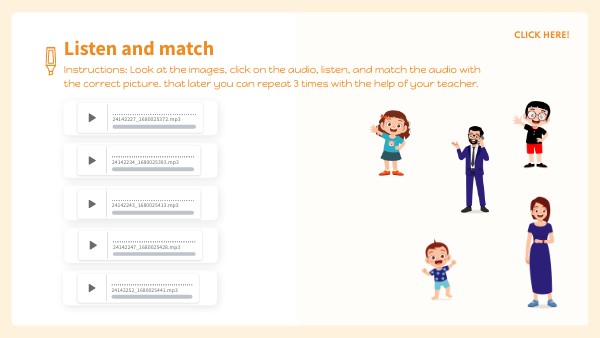 Instructions: Look at the images, click on the audio, listen, and match the audio with the correct picture. that later you can repeat 3 times with the help of your teacher.