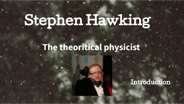 -He born on 8 january 1942 in Oxford in a highly educated family -He studied in Oxford and took physics and chemistry be cause on the time oxford didn't have a math degree, he was in the boat club - After his graduation in worked on if PhD in Campbridge but he started to get really sick, his speech became slurred and he became very clumsy by dropping items or falling for no reason -His disease is named ALS, doctors said that he have just few yers to live, so he wanted to finish his PhD before he dies, in the same time he fell inlove with Lane Wilde, with Jane and his work he had a reason to live -Despite the initial diagnosis from his doctors, Hawking lived a full and productive life with the help of science and modern medicine. Although he was confined to a wheelchair and could not talk for much of his life, he was able to communicate using a touch pad computer and a voice synthesizer. -Stephen Hawking spent much of his time working theories on Black holes and Space-time, his most famous one is that Blackholes emit radiation, we call them Hawking Radiation -He also wrote books like A Brief History in Time, which covers moderns subjects on cosmology such as big bang or black holes in terms that could be understand by everyone. This book was really popular. he also wrote others books: A Briefer History in Time, On the Shoulders of Giants, and The Universe in a Nutshell.