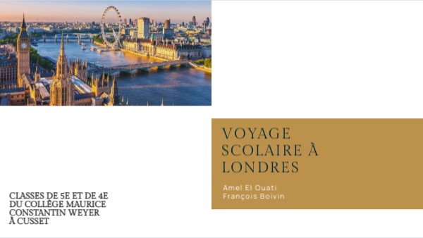Classes concernées: 5e2, 5e3, 5e7, 4e1, 4e6 Nombre d’élèves: 49 élèves Lieu: Angleterre, Londres Notre organisme: VEFE Voyage scolaire Dates du voyage: 20 mai 2024 au 25 mai 2024 Transport: Car + Ferry Professeurs accompagnateurs: Mme El Ouati : professeur d'anglais Mme Rigolet: professeur d'anglais Mr Boivin: professeur d’anglais Mr Raynaud: professeur de mathématiques