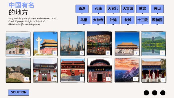 Drag and drop the pictures in the correct order.Check if you got it right in 'Solution'. (ให้นักเรียนจับคู่ชื่อสถานที่กับรูปภาพ)