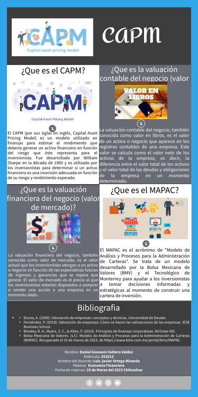 El CAPM (por sus siglas en inglés, Capital Asset Pricing Model) es un modelo utilizado en finanzas para estimar el rendimiento que debería generar un activo financiero en función del riesgo que éste representa para el inversionista. Fue desarrollado por William Sharpe en la década de 1960 y es utilizado por los inversionistas para determinar si un activo financiero es una inversión adecuada en función de su riesgo y rendimiento esperado.