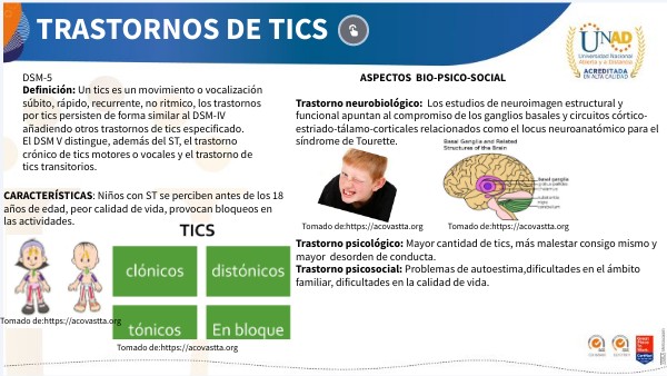 ASPECTOS BIO-PSICO-SOCIAL Trastorno neurobiológico: Los estudios de neuroimagen estructural y funcional apuntan al compromiso de los ganglios basales y circuitos córtico-estriado-tálamo-corticales relacionados como el locus neuroanatómico para el síndrome de Tourette. Trastorno psicológico: Mayor cantidad de tics, más malestar consigo mismo y mayor desorden de conducta. Trastorno psicosocial: Problemas de autoestima,dificultades en el ámbito familiar, dificultades en la calidad de vida.