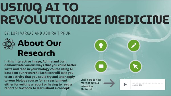 In this Interactive Image, Adhira and Lori, demonstrate various ways that you could better write and read in your biology course using AI based on our research! Each Icon will take you to an activity that you could try and later apply to your biology course for any assignment, either for writing a report or having to read a report or textbook to learn about a concept!