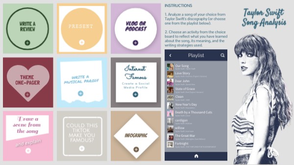 Students will analyze a song by Taylor Swift and choose a presentation option using the choice board.