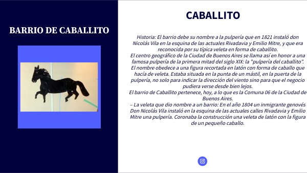 Historia: El barrio debe su nombre a la pulpería que en 1821 instaló don Nicolás Vila en la esquina de las actuales Rivadavia y Emilio Mitre, y que era reconocida por su típica veleta en forma de caballito. El centro geográfico de la Ciudad de Buenos Aires se llama así en honor a una famosa pulpería de la primera mitad del siglo XIX: la "pulpería del caballito". El nombre obedece a una figura recortada en latón con forma de caballo que hacía de veleta. Estaba situada en la punta de un mástil, en la puerta de la pulpería, no solo para indicar la dirección del viento sino para que el negocio pudiera verse desde bien lejos. El barrio de Caballito pertenece, hoy, a lo que es la Comuna 06 de la Ciudad de Buenos Aires. – La veleta que dio nombre a un barrio: En el año 1804 un inmigrante genovés Don Nicolás Vila instaló en la esquina de las actuales calles Rivadavia y Emilio Mitre una pulpería. Coronaba la construcción una veleta de latón con la figura de un pequeño caballo.