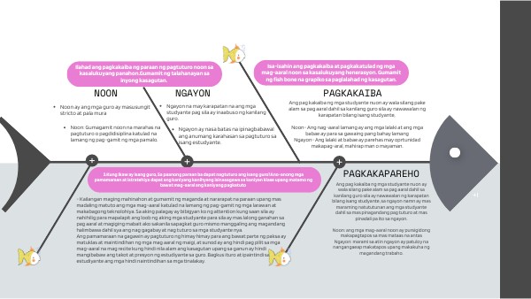 Isa-isahin ang pagkakaiba at pagkakatulad ng mga mag-aaral noon sa kasalukuyang henerasyon. Gumamit ng fish bone na grapiko sa paglalahad ng kasagutan.