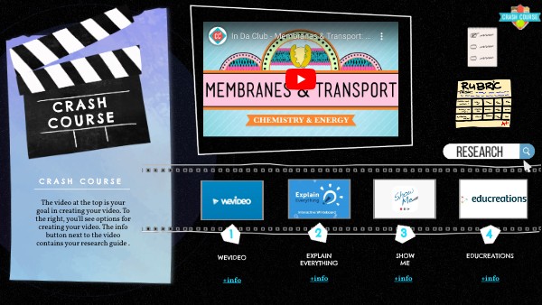 The video at the top is your goal in creating your video. To the right, you'll see options for creating your video. The info button next to the video contains your research guide .
