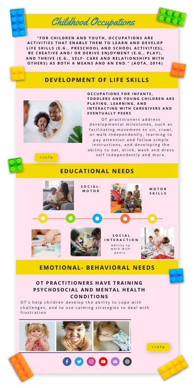 "For children and youth, occupations are activities that enable them to learn and develop life skills (e.g., preschool and school activities), be creative and/ or derive enjoyment (e.g., play), and thrive (e.g., self- care and relationships with others) as both a means and an end." (AOTa, 2014)