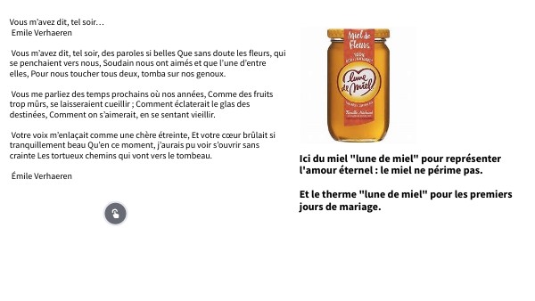 Ici du miel "lune de miel" pour représenter l'amour éternel : le miel ne périme pas. Et le therme "lune de miel" pour les premiers jours de mariage.