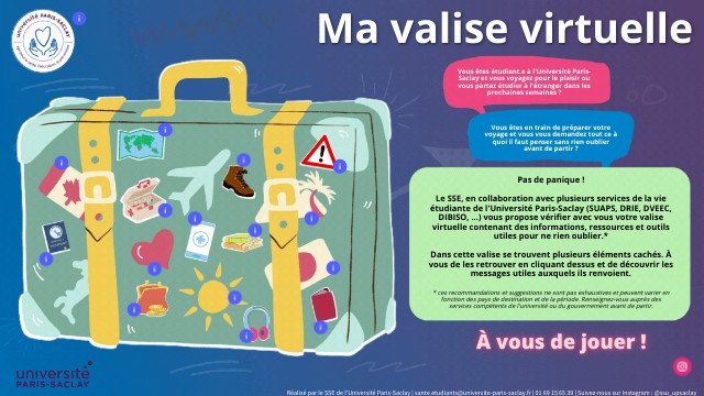 Pas de panique ! Le SSE, en collaboration avec plusieurs services de la vie étudiante de l'Université Paris-Saclay (SUAPS, DRIE, DVEEC, DIBISO, ...) vous propose vérifier avec vous votre valise virtuelle contenant des informations, ressources et outils utiles pour ne rien oublier.* Dans cette valise se trouvent plusieurs éléments cachés. À vous de les retrouver en cliquant dessus et de découvrir les messages utiles auxquels ils renvoient.
