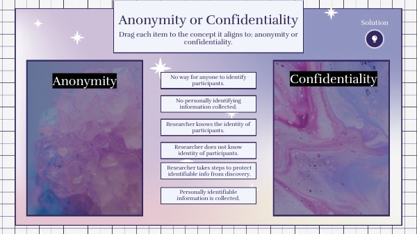 Drag each item to the concept it aligns to: anonymity or confidentiality.