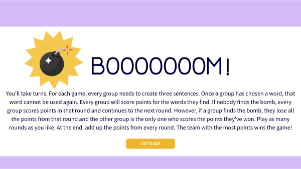You'll take turns. For each game, every group needs to create three sentences. Once a group has chosen a word, that word cannot be used again. Every group will score points for the words they find. If nobody finds the bomb, every group scores points in that round and continues to the next round. However, if a group finds the bomb, they lose all the points from that round and the other group is the only one who scores the points they've won. Play as many rounds as you like. At the end, add up the points from every round. The team with the most points wins the game!