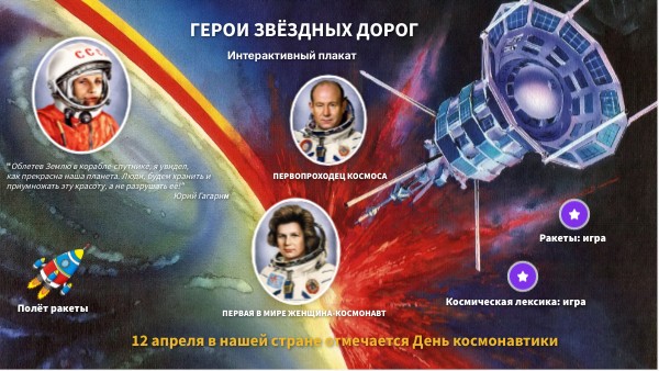 "Облетев Землю в корабле-спутнике, я увидел, как прекрасна наша планета. Люди, будем хранить и приумножать эту красоту, а не разрушать её!" Юрий Гагарин