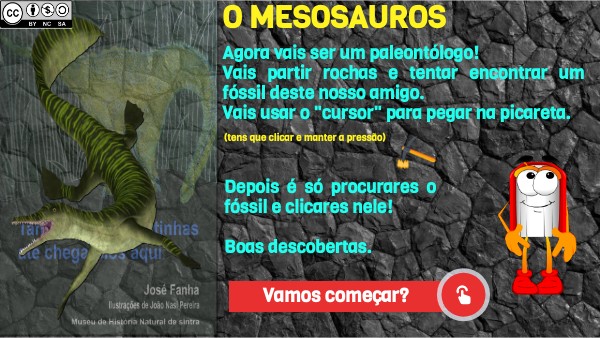 Agora vais ser um paleontólogo! Vais partir rochas e tentar encontrar um fóssil deste nosso amigo. Vais usar o "cursor" para pegar na picareta.