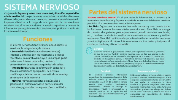 El sistema nervioso tiene tres funciones básicas: la sensitiva, la integradora y la motora.– Sensorial: Percibe los cambios (estímulos) internos y externos con los receptores u órganos receptivos. Los cambios incluyen una amplia gama de factores físicos como la luz, presión o concentración de sustancias químicas disueltas.– Integradora: Analiza la información sensorial y toma las decisiones apropiadas. Se activa o modifica por la información que está almacenada y se recupera de la memoria.– Motora: Provoca respuestas de músculos o glándulas. El sistema nervioso puede estimular músculos y glándulas para que actúen o inhibirlos.