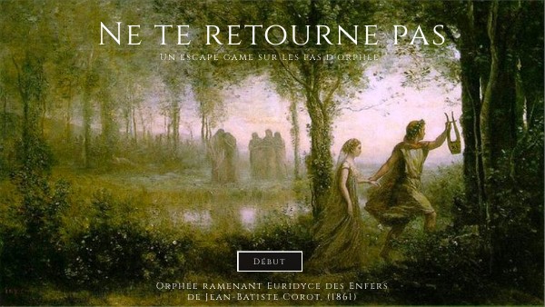 Vous êtes Orphée. Désepéré par la mort d'Eurydice, vous voici arrivé à l'entrée des enfers. Vous souhaitez ramener votre bien aimée dans le monde des vivants, mais de nombreuses épreuves vous attendent. Saurez-vous déjouer les pièges et rassembler tous les chiffres du code qui vous permettront de ramener celle que vous aimez à la vie ?
