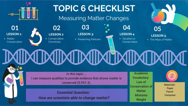 In this topic....I can measure qualities to provide evidence that shows matter is conserved (5.PS1.2).