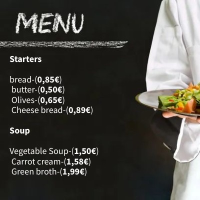 Starters bread-(0,85€) butter-(0,50€) Olives-(0,65€) Cheese bread-(0,89€) Soup Vegetable Soup-(1,50€) Carrot cream-(1,58€) Green broth-(1,99€)