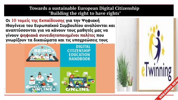 Οι 10 τομείς της Εκπαίδευσης για την Ψηφιακή Ιθαγένεια του Ευρωπαϊκού Συμβουλίου αναλύονται και αναπτύσσονται για να κάνουν τους μαθητές μας να γίνουν ψηφιακά συνειδητοποιημένοι πολίτες που γνωρίζουν τα δικαιώματα και τις υποχρεώσεις τους στον κόσμο του Ιστού, σύμφωνα με την ψηφιακή βιωσιμότητα.