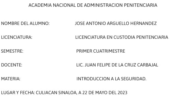 NOMBRE DEL ALUMNO: JOSE ANTONIO ARGUELLO HERNANDEZLICENCIATURA: LICENCIATURA EN CUSTODIA PENITENCIARIA SEMESTRE: PRIMER CUATRIMESTRE DOCENTE: LIC. JUAN FELIPE DE LA CRUZ CARBAJAL MATERIA: INTRODUCCION A LA SEGURIDAD. LUGAR Y FECHA: CULIACAN SINALOA, A 22 DE mayo DEL 2023