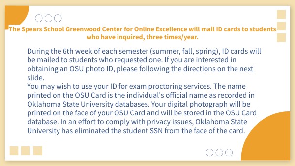During the 6th week of each semester (summer, fall, spring), ID cards will be mailed to students who requested one. If you are interested in obtaining an OSU photo ID, please following the directions on the next slide. You may wish to use your ID for exam proctoring services. The name printed on the OSU Card is the individual's official name as recorded in Oklahoma State University databases. Your digital photograph will be printed on the face of your OSU Card and will be stored in the OSU Card database. In an effort to comply with privacy issues, Oklahoma State University has eliminated the student SSN from the face of the card.
