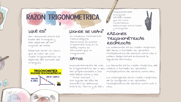 La cosecante es la razón recíproca del seno, o también su opuesto multiplicativo. Se abrevia como csc o cosec. Observemos entonces la siguiente fórmula. La secante es la razón recíproca del coseno o también su opuesto multiplicativo. Se abrevia como sec. La cotangente es la razón recíproca de la tangente o su opuesto multiplicativo. Se abrevia como cot o cta.