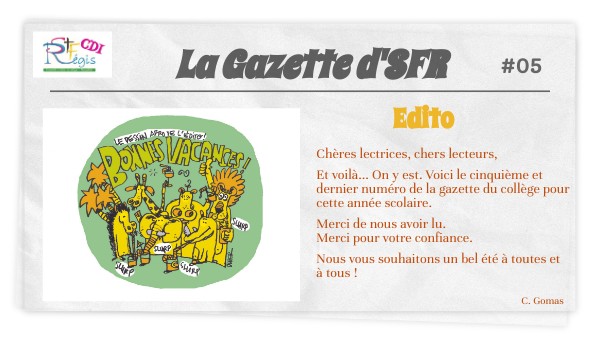 Chères lectrices, chers lecteurs,Et voilà... On y est. Voici le cinquième et dernier numéro de la gazette du collège pour cette année scolaire. Merci de nous avoir lu. Merci pour votre confiance. Nous vous souhaitons un bel été à toutes et à tous !