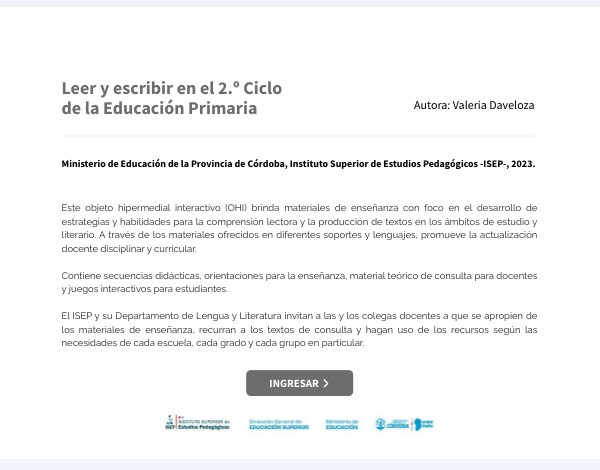 Este objeto hipermedial interactivo (OHI) brinda materiales de enseñanza con foco en el desarrollo de estrategias y habilidades para la comprensión lectora y la producción de textos en los ámbitos de estudio y literario. A través de los materiales ofrecidos en diferentes soportes y lenguajes, promueve la actualización docente disciplinar y curricular. Contiene secuencias didácticas, orientaciones para la enseñanza, material teórico de consulta para docentes y juegos interactivos para estudiantes. El ISEP y su Departamento de Lengua y Literatura invitan a las y los colegas docentes a que se apropien de los materiales de enseñanza, recurran a los textos de consulta y hagan uso de los recursos según las necesidades de cada escuela, cada grado y cada grupo en particular.