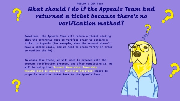 In cases like these, we will need to proceed with the account verification process, and after completing it, we will be using the “Account Ownership::Ownership Review::Send to Appeals - Ownership Verified” macro to properly send the ticket back to the Appeals Team.