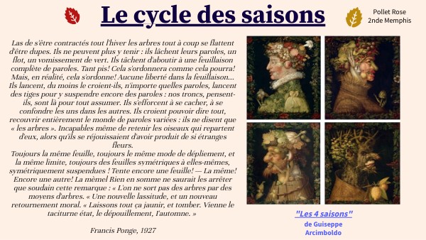 L'oeuvre que j'ai choisie est un poème de Francis Ponge: " Le cycle des saisons". Dans son oeuvre, Ponge dénonce l'utilisation de la parole par l'homme la jugeant incontrôlable voire incapable de progresser puisqu'elle refait toujours les mêmes erreurs de façon cyclique. Ponge offre une réflexion sur cette parole en s'appuyant sur une personnification de la Nature et plus précisément des arbres. En effet, les bourgeons, les feuilles des arbres font référence au langage des Hommes. En hiver, la nature "dort", il y a donc peu de choses à raconter, mais lorsque le printemps arrive la parole se libère et les arbres produisent alors beaucoup de bourgeons et cela provoque une symbolique du flot de bavardages. J'ai aimé ce poème car il illustre la parole qui pour moi est une expression des sentiments et du partage qui me pose souvent question. Comment certains font-ils pour parler sans cesse? Ou d'autres pour avoir plein de choses intéressantes à raconter? Ou d'autres encore qui parlent pour ne rien dire? Sans oublier ceux qui se taisent que peuvent-ils penser? Pour réaliser mon anthologie poétique cela n'a pas été facile, et mon débit de parole a augmenté chaque jour cherchant à trouver des arguments capables de vous convaincre. Même mon chat se mettait à me répondre en miaulant... j'ai donc fini par choisir neuf poèmes qui ont tous des liens avec le poème de Francis Ponge : évoquant un rapport Nature-Homme, ou un rapport au temps qui passe ou des oppositions... J'ai également eu des difficultés car je ne connais pas toutes les règles de l'écrit poétique et surtout comment les repérer. J'ai choisi de mettre mes poèmes par ordre chronologique pour montrer que de tout temps les poètes écrivaient sur les Hommes, la Nature et le temps qui passe. J'ai aimé réaliser ce travail car pour moi la poésie permet de faire éprouver aux autres les sentiments que nous gardons à l'intérieur de nous. Le poème est donc une partie du poète. La poésie permet de critiquer, de défendre une idée, de déclarer son amour, de porter conseil, de dire le beau, le laid... J'aime aussi la poésie pour ses jeux de mots et sa forme libre d'expression. D'ailleurs, poésie, vient d'un mot grec qui veut dire « faire, créer ». Avec les mots, le poète fait ce qu'il veut : il les fait rimer entre eux, il s'amuse avec leur sonorité, il coupe les phrases en deux, joue sur les figures de styles. J'apprécie également déchiffrer les nombreux messages cachés et de savoir pourquoi le poète à voulu nous dire ça même si cela est parfois compliqué.