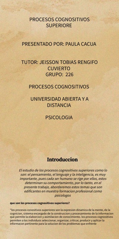 PROCESOS COGNOSITIVOS SUPERIORE PRESENTADO POR: PAULA CACUA TUTOR: JEISSON TOBIAS RENGIFO CUVIERTO GRUPO: 226 PROCESOS COGNOSITIVOS UNIVERSIDAD ABIERTA Y A DISTANCIA PSICOLOGIA