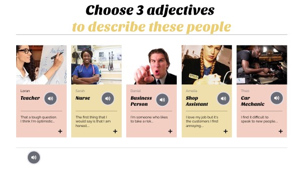 That's a tough question. I think I'm optimistic because I usually expect good things to happen so consequently you never see me moody or unhappy. I'm good fun to be around and I often make jokes with my students who like my sense of humour. We get along well together. I rarely take any days off work and I love my job. I enjoy meeting new people. That's how you find out so much about them.