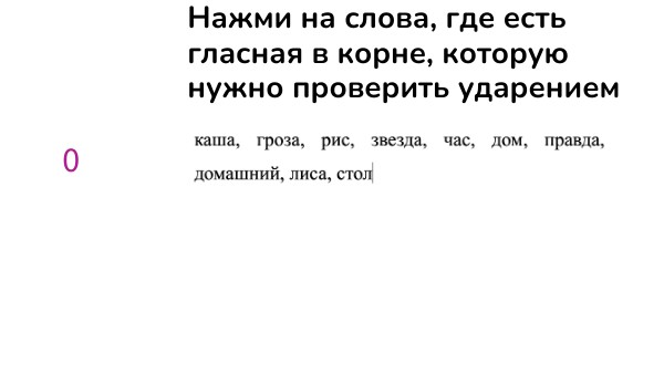 Нажми на слова, где есть гласная в корне, которую нужно проверить ударением