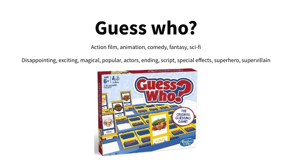 Action film, animation, comedy, fantasy, sci-fi Disappointing, exciting, magical, popular, actors, ending, script, special effects, superhero, supervillain