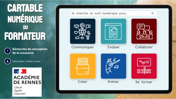 Ce cartable numérique du formateur ou de la formatrice s'inspire d'une ressource créée en direction des enseignants de l'AEFE. Parti d'un besoin d'information et de formation dans l'académie de Rennes suite au développement de formations hybrides, cet outil cherche à partir d'une question vis-à-vis des grandes catégories d'usages pour aller vers les outils. Ces derniers sont exclusivement des outils éducatifs libres et prioritairement utilisés et développés dans l'académie de Rennes. Ce cartable est perfectible et attendons des utilisateurs des retours critiques et constructifs en vue de l'améliorer, l'augmenter et le mettre à jour.