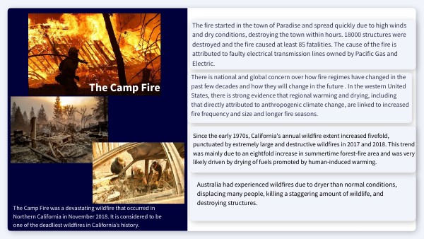 The fire started in the town of Paradise and spread quickly due to high winds and dry conditions, destroying the town within hours. 18000 structures were destroyed and the fire caused at least 85 fatalities. The cause of the fire is attributed to faulty electrical transmission lines owned by Pacific Gas and Electric.