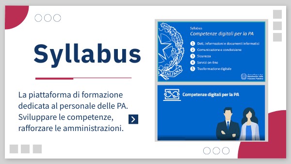 In Syllabus puoi trovare un’offerta formativa ampia, gratuita e costantemente aggiornata. Utile per migliorare le competenze dei dipendenti pubblici e per supportare i processi di innovazione delle amministrazioni, a partire da quelli relativi alla transizione digitale, ecologica e amministrativa.