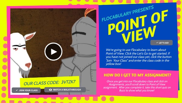 We're going to use Flocabulary to learn about Point of View. Click the Let's Go to get started. If you have not joined our class yet, click the button "Join Your Class" and enter the class code in the yellow box!