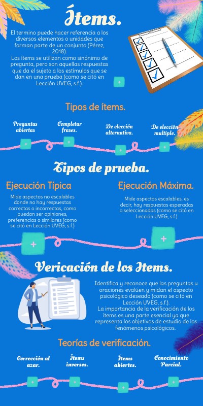 El termino puede hacer referencia a los diversos elementos o unidades que forman parte de un conjunto (Pérez, 2018). Los ítems se utilizan como sinónimo de pregunta, pero son aquellas respuestas que da el sujeto a los estímulos que se dan en una prueba (como se citó en Lección UVEG, s.f.).