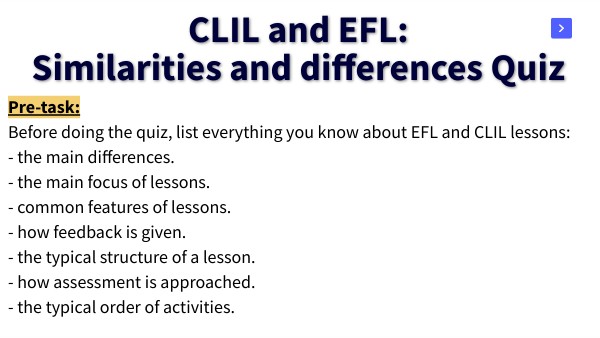 Pre-task:Before doing the quiz, list everything you know about EFL and CLIL lessons:- the main differences. - the main focus of lessons. - common features of lessons. - how feedback is given. - the typical structure of a lesson. - how assessment is approached. - the typical order of activities.