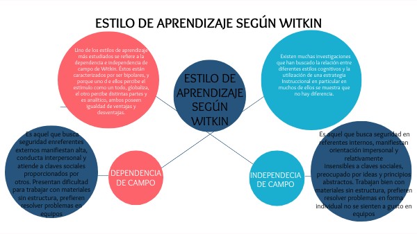 Uno de los estilos de aprendizaje más estudiados se refiere a la dependencia e independencia de campo de Witkin. Éstos están caracterizados por ser bipolares, y porque uno d e ellos percibe el estímulo como un todo, globaliza, el otro percibe distintas partes y es analítico, ambos poseenigualdad de ventajas y desventajas.