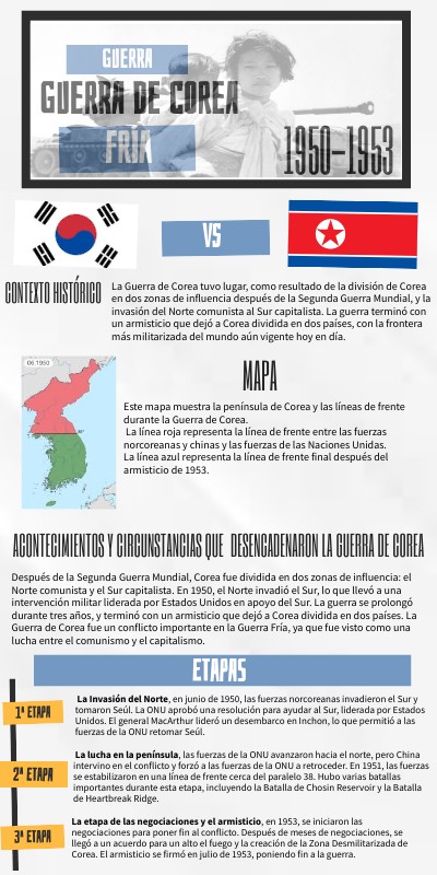 La Guerra de Corea tuvo lugar, como resultado de la división de Corea en dos zonas de influencia después de la Segunda Guerra Mundial, y la invasión del Norte comunista al Sur capitalista. La guerra terminó con un armisticio que dejó a Corea dividida en dos países, con la frontera más militarizada del mundo aún vigente hoy en día.