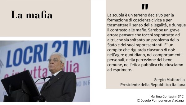 La scuola è un terreno decisivo per la formazione di coscienza civica e per trasmettere il senso della legalità, e dunque il contrasto alle mafie. Sarebbe un grave errore pensare che tocchi soprattutto ad altri, che sia soltanto un problema dello Stato e dei suoi rappresentanti. E' un compito che riguarda ciascuno di noi: nell'agire quotidiano, nei comportamenti personali, nella percezione del bene comune, nell'etica pubblica che riusciamo ad esprimere. Sergio Mattarella Presidente della Repubblica Italiana